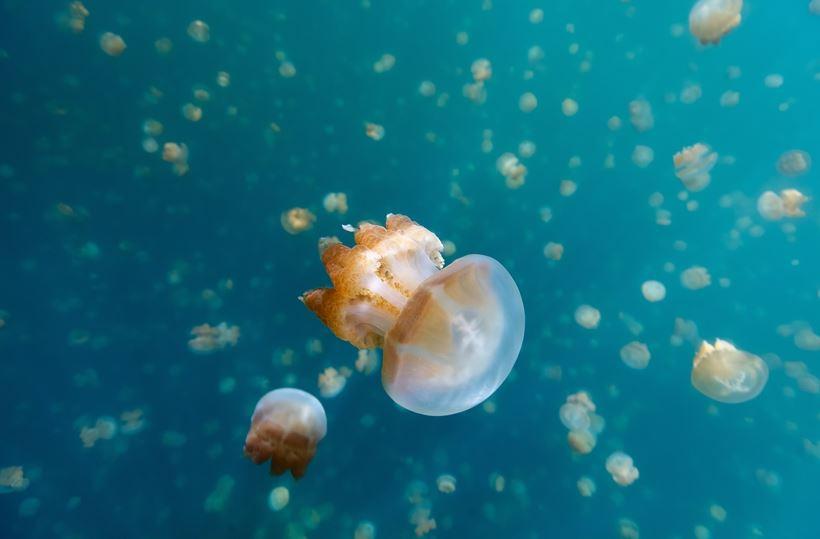 一探世界知名奇景獨一無二的『無毒水母湖』的神秘,爬過一座小山後,即可到達,這座無波的湖泊其底部與外海相通,需行光合作用的水母,每當陽光直射時成千上萬粉橘透明的,大大小小水母便漂浮上來,是您與水母共舞的最佳時機,其外型晶瑩剔透,觸摸起來像果凍般柔嫩令人愛憐。湖中數以萬計如果凍般晶瑩剔透的無毒水母,就好像在辦一場盛大的舞會,在這山中的湖泊裡群起響應。